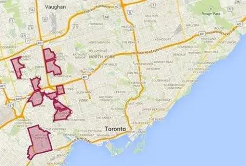 The highest density of Somalis is approximately 22,000 located in Etobicoke (20 km West-Northwest of downtown Toronto). The overwhelming majority of 2016 census respondents in Toronto who said they speak Somali live in central Etobicoke in the Weston and Lawrence area, the Kingsview-Village-The Westway neighbourhood south of Highway 401, north of The Westway and St. Phillips Road, as well as in the Etobicoke neighbourhoods of Mount Olive-Silverstone-Jamestown, Islington-City Centre West, Elms-Old Rexdale, and Willowridge-Martingrove-Richview. Somalis in the GTA also live in Brampton, York University Heights, Willowdale, and Scarborough.